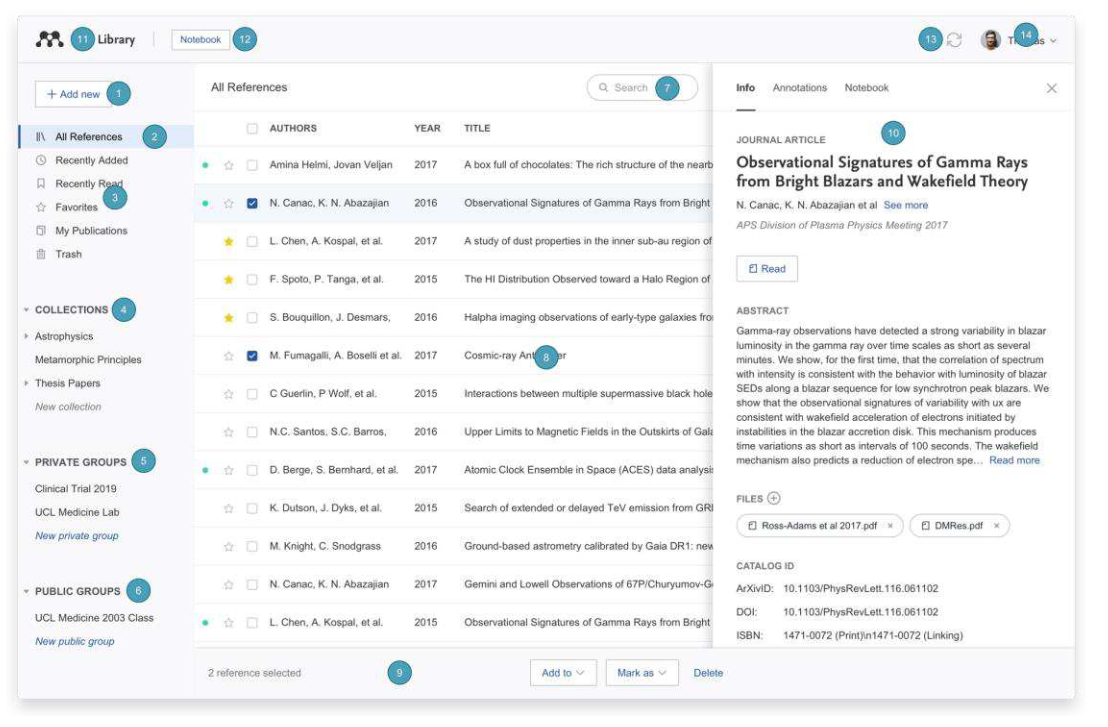 Mendeley Web: The Mendeley website where you can access the web version of your library, edit your profile, and search for papers, groups, or people. It also includes Mendeley’s social features.